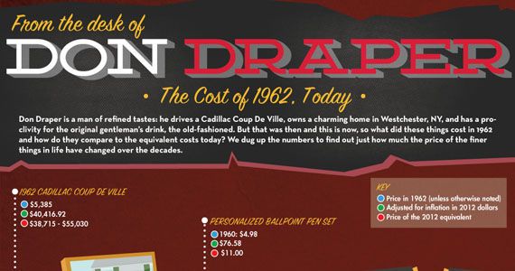Breaking down the life of Don Draper, the infographic compares the cost of Draper's life in 1962 with what the equivalent would be in today's world. While living the life of Don Draper may have been difficult in 1962, it appears even more so in today's world – especially with a significant pay cut stemming from what his position would earn now.
